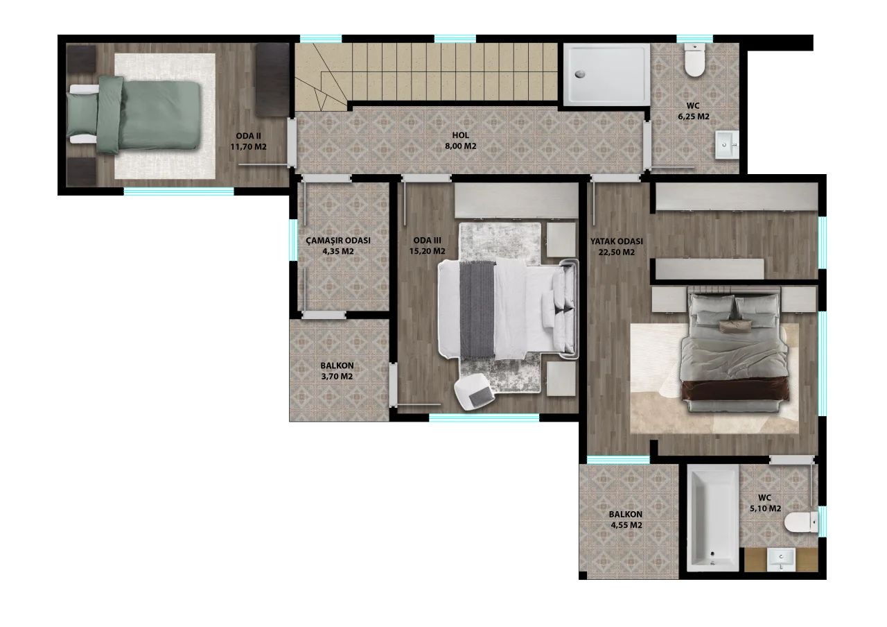 İç cephe uygulaması: Kaba karışık alçı, derz bandı, iki kat saten alçı ve silinebilir Filli marka boya