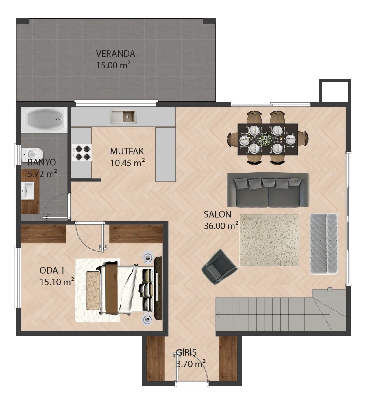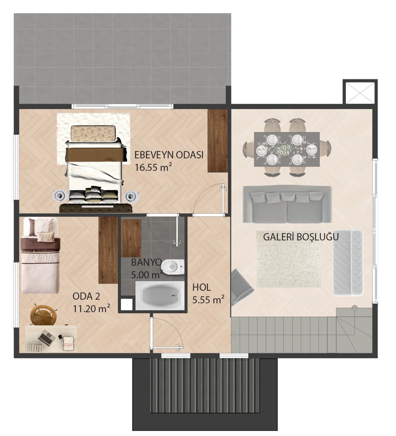 İç cephe uygulaması: Kaba karışık alçı, derz bandı, iki kat saten alçı ve silinebilir Filli marka boya