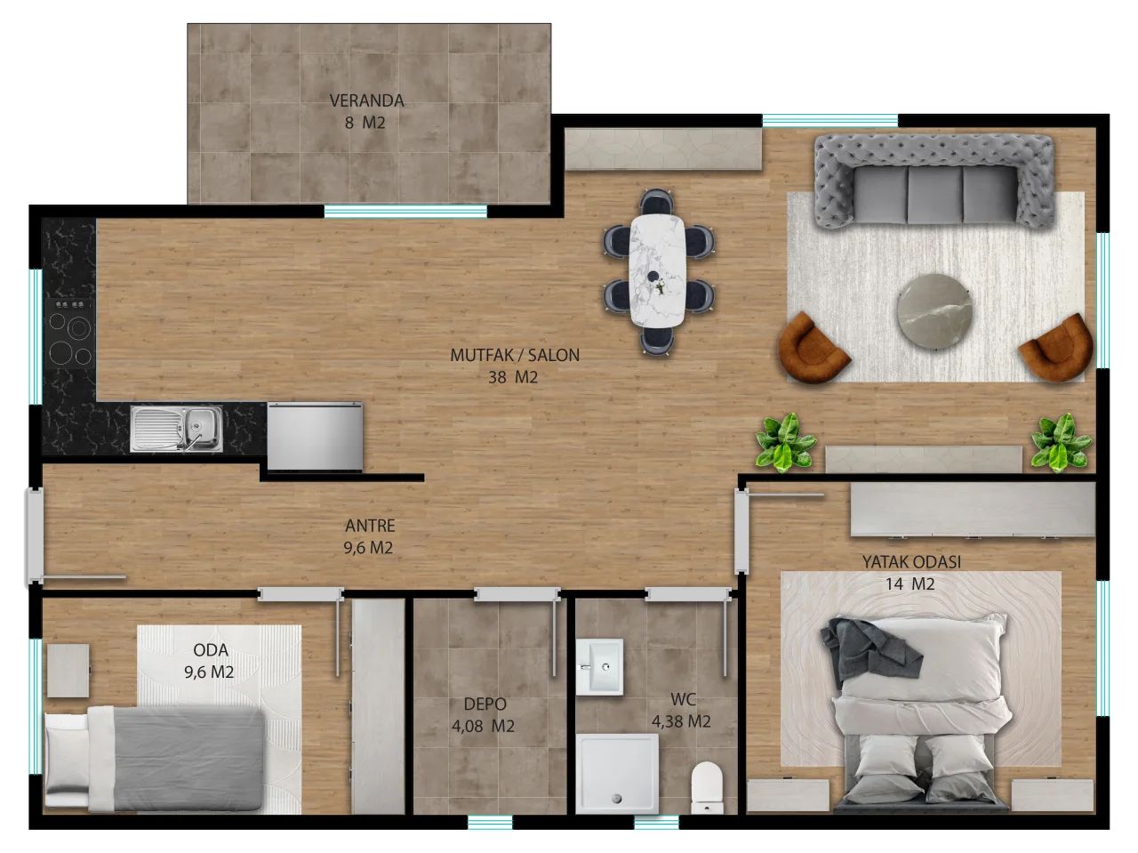 İç cephe uygulaması: Kaba karışık alçı, derz bandı, iki kat saten alçı ve silinebilir Filli marka boya